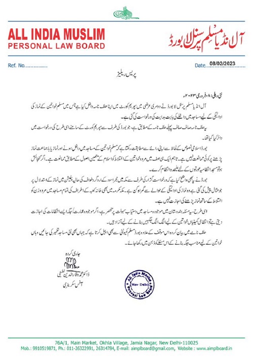 ملک میں مسلم خواتین کے مساجد میں داخل ہونے کو لے کر بحث کے درمیان آل انڈیا مسلم پرسنل لا بورڈ (اے آئی ایم پی ایل بی) نے سپریم کورٹ میں حلف نامہ داخل کر کے بتایا کہ مسلم خواتین کے مساجد میں داخل ہونے پر کوئی پابندی نہیں ہے ،وہ مساجد میں داخل ہونے اور نماز پڑھنے کے لئے آزاد ہیں ۔ میڈیا رپورٹوں کے مطابق گزشتہ روز آل انڈیا مسلم پرسنل لاء بورڈ نے سپریم کورٹ کو بتایا کہ خواتین کو مسجد میں داخل ہونے اور نماز پڑھنے کی اجازت ہے۔ بورڈ نے کہا کہ مسلم خواتین نماز پڑھنے کے لیے مسجد میں داخل ہونے کے لیے آزاد ہیں اور یہ ان پر منحصر ہے کہ وہ مسجد میں نماز پڑھنے کے اپنے حق کا استعمال کرنا چاہتی ہیں یا نہیں۔ اے آئی ایم پی ایل بی نے سپریم کورٹ میں حلف نامہ داخل کرکے یہ معلومات دی ہے۔ یہ حلف نامہ مسلم خواتین کی مسجد میں نماز پڑھنے سے متعلق ایک عرضی سے متعلق دائر کیا گیا ہے۔